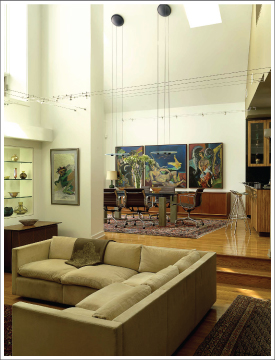 The eighty-year old cottage style home that provided the starting point for this project had two worthwhile features: a heavily wooded lot and its location in Old Town Clayton. The postage stamp-sized lot on which it was situated possessed an extremely steep front yard and a three-story apartment building which ran along its entire southern boundary. Among the design imperatives were these: remove only those trees that were absolutely necessary, provide lots of natural light, space for art, and room to entertain large groups or small with equal comfort and appropriate intimacy. The solution was to add a large addition to the rear of the home to provide the requisite public space, while changing the program of the existing house to provide the space for the private sector. The exterior repeats certain architectural features of the existing house: painted lap siding, roof pitches, and shed dormers, but the interior of the new space is a radical departure from the traditional story and a half program of the old. To meet the side setbacks of the trapezoidal lot, the addition has been split along its lateral axis and the halves offset by four feet. The interior of the space is open along its northern two thirds to allow expansive views of the woods through trapezoid windows which have the same pitch as the roof which soars to 27 feet. Seven skylights provide an abundance of natural light. The southern section is bisected by a loft which cuts across the space at a 15 degree angle. Beneath this loft are an open kitchen with cabinets of Zebrawood and Wenge, and an intimate seating area with steel and brick clad fireplace. A large spiral stair leads to the loft workspace and a private roof deck above the entry that look out into the trees. |