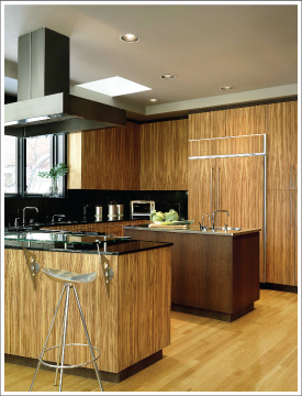 This kitchen, which is part of a whole house renovation and addition, replaces a tiny and utterly dysfunctional one which has since been converted into an admirable laundry room. Nestled under a loft, which bisects the new addition on a fifteen-degree angle (referring to the angle at which the house is situated on the site), the kitchen’s peninsula and seating area repeat this angle with their trapezoidal shape. The kitchen is open to the dining room, and the peninsula provides a gathering area for guests while the owners finish preparing meals. Since the kitchen is totally open to the rest of the space, it was mandatory that it not only function well, but that it look beautiful as well. The design combines the understated elegance of minimalism with the richness of rarely seen materials. The cabinets are built of book matched Zebrawood veneers with top fillers and kicks of Wenge. The island and the interiors of the two display cabinets are Wenge as well. All are hand finished with a penetrating resin which protects them without producing the artificial look of conventional finishes. The dishwashers and trash compactor have Zebrawood panels which match the surrounding cabinets. For increased utility, drawers replace the doors normally found on most base cabinets. Recessed xenon puck lights provide lighting for countertops and display cabinets. The countertops and full height splashes which clad the walls are 2 cm Galaxy Black granite. The island top and corner shelf are stainless steel, as are the custom designed hood, built in food scale, and the custom-made shelf supports at the glass shelf of the peninsula. A desk for household bill paying with bulletin board of perforated metal and cork, and a full height bookcase for cookbooks (not visible in photos) complete the space. |