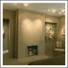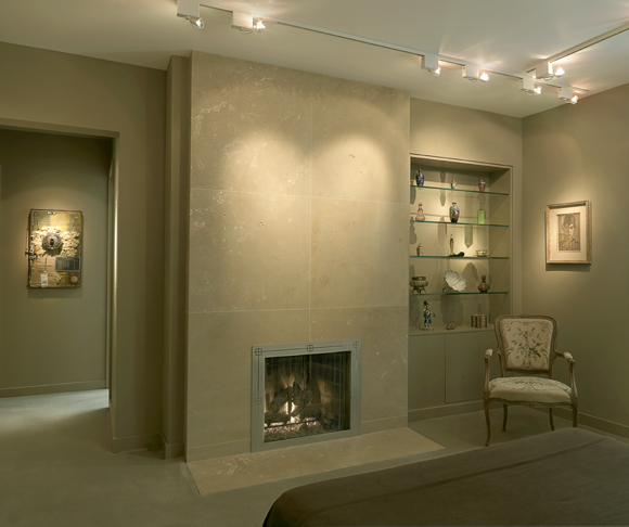 Utilizing space from the original living room in the existing house, the master bedroom is a study in serenity and restfulness. The fireplace, which was originally painted brick with a bulky wooden mantle, is now clad in slabs of St. Remy limestone to pair the space seamlessly with its en suite master bath, and the fireplace screen is fashioned of polished stainless steel which has a pattern surrounded by a bead blasted background. Low voltage track lights provide light for the paintings and antique glass collection displayed on open shelves of ½" glass. A platform bed with a deeply recessed base appears to float above the carpeted floor. The rear corners have been framed on a forty-five degree angle to enhance the intimacy of the space. French doors close off the suite from a library, which by another set of French doors can be opened to the public spaces of the house, or closed to create a private wing. |