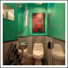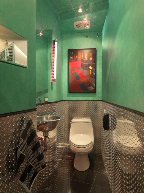 It took quite some time to find the insight that would actually make the space work, and it was my wife who finally provided the design inspiration, when she came up with the idea of taking decorative elements from an artsy back painted perfume bottle. We chose to angle the walls on the sink side to eek out a little more width for the space, modified a stainless bar sink with the addition of a laser cut ring of stainless below the rim of the sink to allow it to project beyond the edge of the countertop. The countertop got a chiseled finish to allude to it needing to be broken off to fit. Cable lights provide light and interesting soffits disguise the large fan, which, in contrast to the one it replaced, actually works. A pocket door provides more privacy and space. A wall mounted faucet saves space on the small countertop. We then used a faux finish on the walls to mimic elements of the perfume bottle, which we displayed in a glass and aluminum lined niche. Aluminum diamond plate sheets were used as a wainscot with a cap of rubber coated steel bar. For fun we added an unusually shaped mirror with violet lights behind it. |