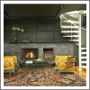 Conceived as a modern reference to the primeval caves in which our prehistoric ancestors sought shelter, this hearth room’s low ceiling (formed by the loft above) and dark color combined with the warmth of the wood burning fireplace produce a sense of security and serenity that is extremely comforting. The seating area is perfectly scaled to promote intimate conversation or peaceful contemplation of the woods and wildlife, which are easily enjoyed through the soaring trapezoid windows in the adjacent great room to the north.