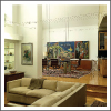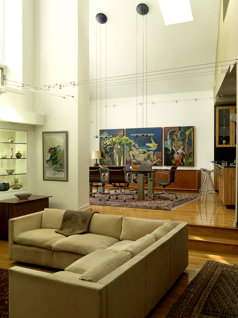 Materials on the fireplace wall are brick and hot rolled steel panels. The mantle is ¾" thick cor-ten steel. The hot rolled and cor-ten steel are repeated in the display niches in the spiral stairs. The choice of these materials was influenced by the work of the San Francisco artist, Moses, two of whose pieces are seen here as well. |