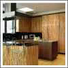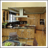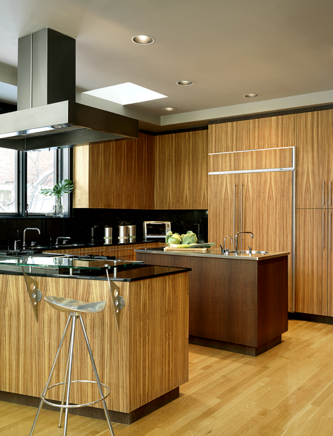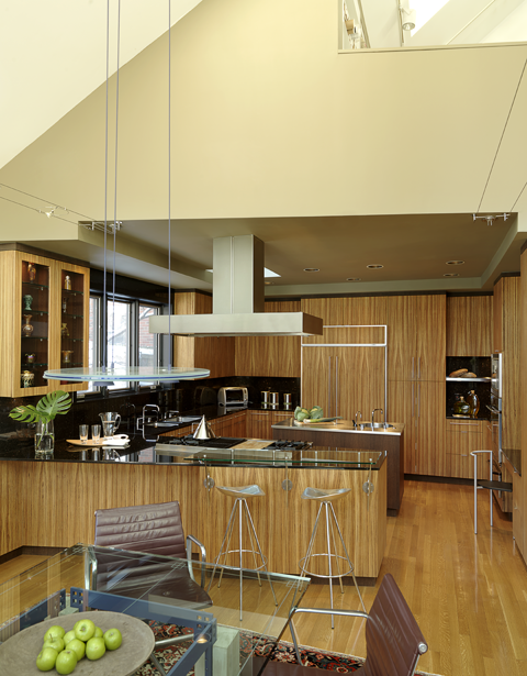This kitchen, which is part of a whole house renovation and addition, replaces a tiny and utterly dysfunctional one which has since been converted into an admirable laundry room. Nestled under a loft, which bisects the new addition on a fifteen-degree angle (referring to the angle at which the house is situated on the site), the kitchen’s peninsula and seating area repeat this angle with their trapezoidal shape. The kitchen is open to the dining room, and the peninsula provides a gathering area for guests while the owners finish preparing meals. Since the kitchen is totally open to the rest of the space, it was mandatory that it not only function well, but that it look beautiful as well. The design combines the understated elegance of minimalism with the richness of rarely seen materials. The cabinets are built of book matched Zebrawood veneers with top fillers and kicks of Wenge. The island and the interiors of the two display cabinets are Wenge as well. All are hand finished with a penetrating resin which protects them without producing the artificial look of conventional finishes. The dishwashers and trash compactor have Zebrawood panels which match the surrounding cabinets. For increased utility, drawers replace the doors normally found on most base cabinets. Recessed xenon puck lights provide lighting for countertops and display cabinets. The countertops and full height splashes which clad the walls are 2 cm Galaxy Black granite. The island top and corner shelf are stainless steel, as are the custom designed hood, built in food scale, and the custom-made shelf supports at the glass shelf of the peninsula. A desk for household bill paying with bulletin board of perforated metal and cork, and a full height bookcase for cookbooks (not visible in photos) complete the space. |