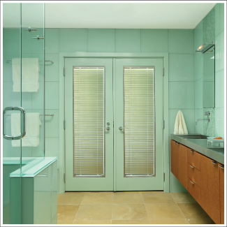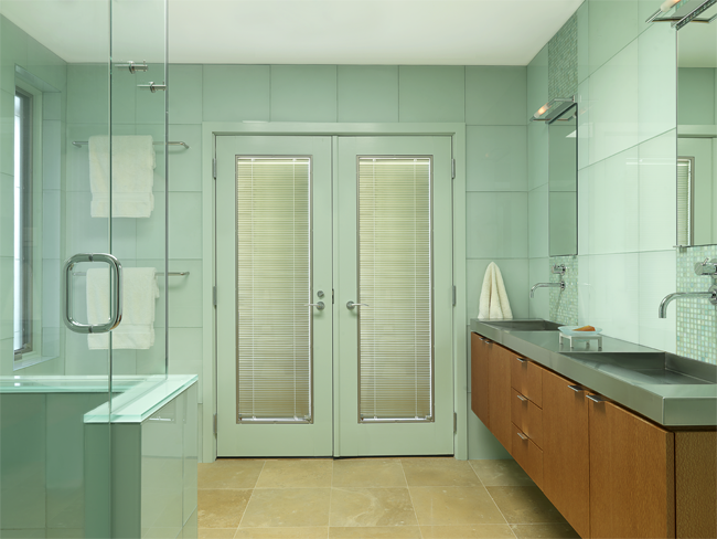 This bath, built in what was once an old screened porch was difficult because of the sloping concrete floor and the unheated garage below which made it almost impossible to keep warm in the winter. Leveling the floor with sand and cement and adding radiant heating solved these problems. On an aesthetic level, we wanted a light, airy space with a spa-like feeling. To get this warmth and luminosity, we used St. Remy limestone for the floor, and we clad the walls, from floor to ceiling with sandblasted glass tile. The shower floor and the accent tile behind the sinks is glass mosaic tile, while the signature quarter circle shower seat is ¾" glass. The window is sandblasted to mimic the grout lines in the wall, and a skylight keeps the room bright throughout all the seasons. The wall-hung vanity is made of Australian lacewood, and is finished with a stainless steel top and completed with integral his and her sinks. |