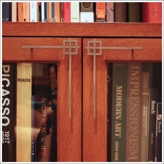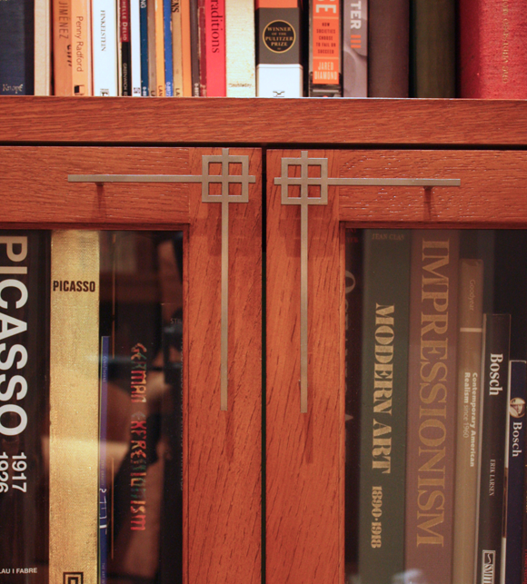 These cabinet pulls were designed for use in our library. The design was derived from the pattern we used for the glass top on our dining room table and repeated in the sand blasted glass in the library doors. They are fabricated from stainless steel.
