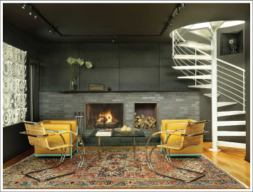 Conceived as a modern reference to the primeval caves in which our prehistoric ancestors sought shelter, this hearth room’s low ceiling (formed by the loft above) and dark color combined with the warmth of the wood burning fireplace produce a sense of security and serenity that is extremely comforting. The seating area is perfectly scaled to promote intimate conversation or peaceful contemplation of the woods and wildlife, which are easily enjoyed through the soaring trapezoid windows in the adjacent great room to the north. Materials on the fireplace wall are brick and hot rolled steel panels. The mantle is ¾" thick cor-ten steel. The hot rolled and cor-ten steel are repeated in the display niches in the spiral stairs. The choice of these materials was influenced by the work of the San Francisco artist, Moses, two of whose pieces are seen here as well. |