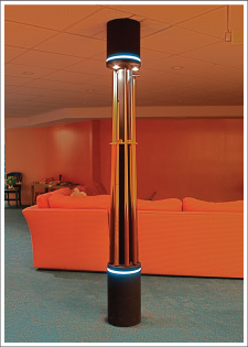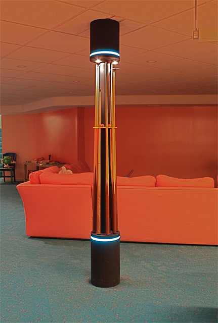 I disguised the column by wrapping it at the floor and ceiling with a wooden cylinder. The bottom cylinder provided a platform for the pool cues to rest on while the top cylinder provided a place for lights to accent them. The column and the cylinders were painted flat black to make the pool cues stand out as a decorative element in the room. To keep the cues in place around the column I used a florescent orange disc of Plexiglas, which glowed brightly under the accent lights. I added a narrow groove around the top and bottom cylinders and installed hidden blue neon lights to separate the column visually from the floor and ceiling and make it appear to be floating. |