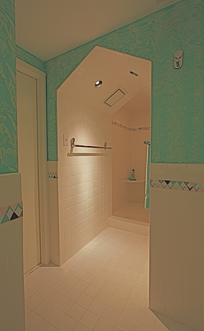 The bathroom was particularly challenging, as it was located near the bottom of the stairs and the logical direction to expand was toward them. I wanted the bathroom to be large enough to be in keeping with the rest of the house, but was constrained to keep the location where it was to avoid breaking up large amounts of the basement floor for the drain lines. There was plenty of space on the other side of the stairs, but the stairwell was finished and the owner did not want to change it. I came up with a creative solution—there was adequate headroom to walk beneath the stairs, thereby extending the footprint of the bathroom. Using the bottom of the stair stringers to form half of a vaulted ceiling, I was able to create a short passage leading to a very spacious open shower. We tiled the entire passageway including the ceiling and turned the stairs into a striking architectural feature.