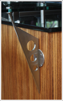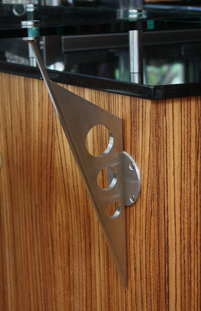 When I decided to use a glass shelf as part of a snack bar area, I created these shelf brackets to add a clean and modern feel to the wood and granite used in the rest of the kitchen peninsula. The design derived from an idea I had had a few years earlier for a handrail bracket that a client chose not to use. The brackets were machined from stainless steel. When my cabinetmaker saw them, he suggested that I enter them in a design competition sponsored by the hardware company, Doug Mockett. They were chosen as the award-winning submission across all categories in the annual Doug Mockett Design Competition in 2003. The bracket is now available as part of the Doug Mockett catalogue of high-end hardware offered worldwide.